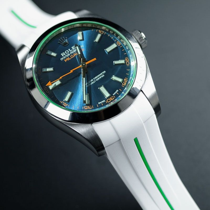 Questo cinturino utilizza l’ingegneria ” Blocked Integration “, incorporando inserti solidi per un montaggio a filo impeccabile e immobile sulla cassa del Submariner da 40 mm.
